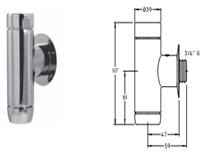 Cierre automático temporizado, 7-10 segundos (3-5 segundos, en el modelo DD) Caudal: 5-8 litros/Pulsación Caudal: 2-2,5 litros/Pulsación corta, en el modelo DD Latón cromado Llave de paso integrada (Regulación de paso o cierre total) Salida para tubo de descarga de diámetro 26×28 Antisifónico Peso aproximado: 740 g